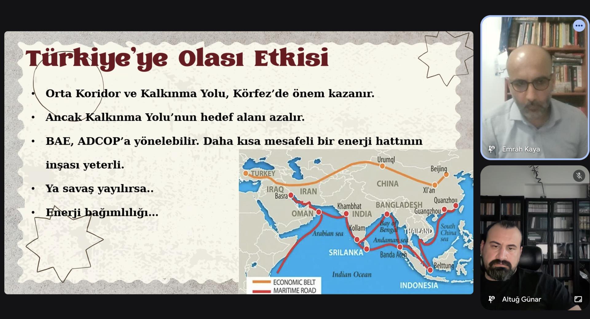 Dr. Öğr. Üyesi Emrah KAYA’nın katılımları ile düzenlenen İsrail ve İran Savaşı Hürmüz Boğazı ve Stratejik Geçiş Noktaları isimli webinar 11 Temmuz saat. 20.00’da gerçekleştirilmiştir. Dr. Öğr. Üyesi Emrah KAYA devam eden İsrail İran Savaşı’nda Hürmüz Boğazı’nın stratejik önemine değinerek, bölgenin savaş nedeni ile karşı karşıya kalacağı tehditler başta olmak üzere, Boğazın küresel ekonomi ve Türkiye için taşımış olduğu tehdit ve fırsatlar hakkında bilgi vermiştir.